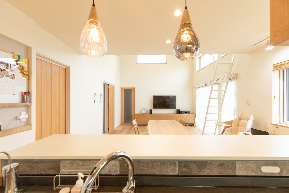キッチンに立つと、LDKが見渡せます。ガラスの照明器具は奥さまお気に入りの一品です。
