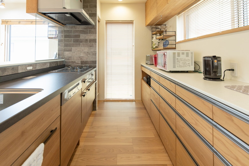 メーカーのキッチンに合わせ、背面収納はすべて造作によるもので、希望の大きさや配置が叶いました。