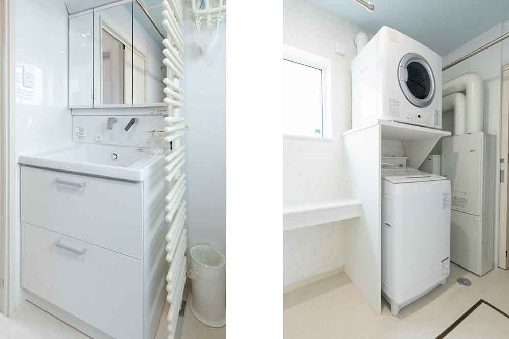 脱衣室の奥はランドリールームになっています。入ってすぐのところには家族専用の洗面化粧台が。その横にはタオルを掛けて干すことが出来るヒーターが付いています。その熱を利用して、下着や靴下が干せるピンチハンガーが吊るされています。