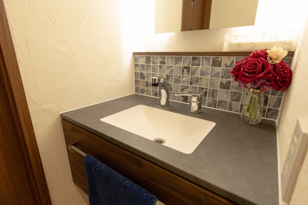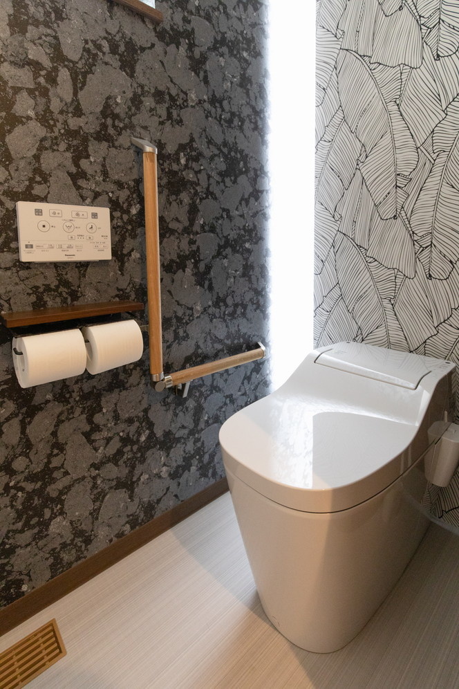 寝室の左手前には来客専用の手洗いとトイレを希望しました。寝室からも近く、夜のおトイレにも便利です。おもてなしの心を感じるラグジュアリーな空間に仕上がっています。「ここは来客用なのでクロスやタイルなどにもこだわりました」とFさん。トイレはアクセントボードの背面に間接照明を設置、見えないトイレットペーパー収納にもなっています。