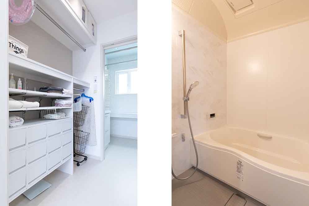 奥さま「リビングから出入りできる脱衣室で服を脱ぎ、すぐにお風呂に入ることができます。脱衣室には入浴後の着替えやタオルが収納できる引き出しをつくってもらいました。子どもたちがまだ小さいので、とても助かっています。洗濯に出す服を一時保管できるバスケットや、ハンガーが掛けられるバーも設置してもらいました」。