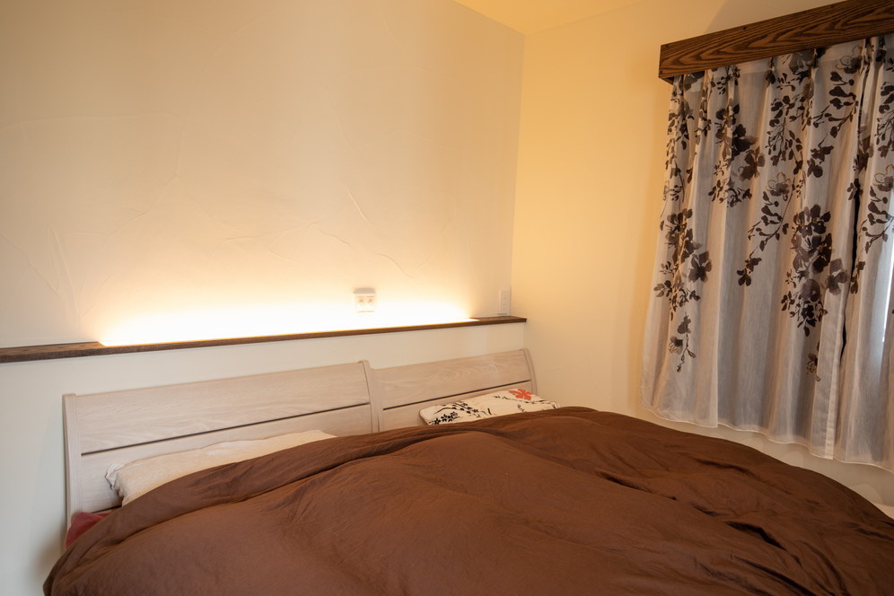 寝室にはベッドが二つ。間接照明付きのベッドヘッドには、スマートフォンの充電などに便利なコンセントも付いています。