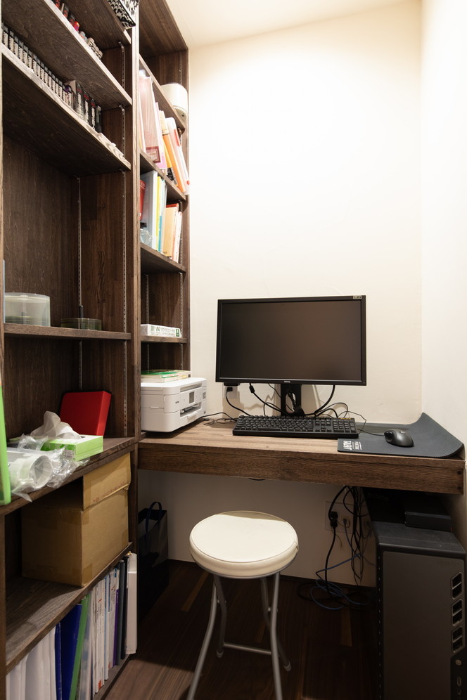 ベッドの左手には書斎コーナーが。大容量の本棚も付いていて、落ち着いて作業に取り組めるスペースになりました。