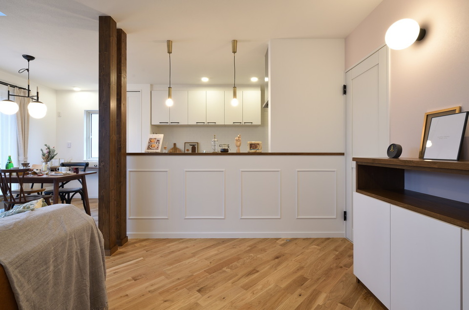 キッチンの腰壁にはモールディングを施しました。スッキリとした上品な装飾が白で統一した壁面によく似合います。