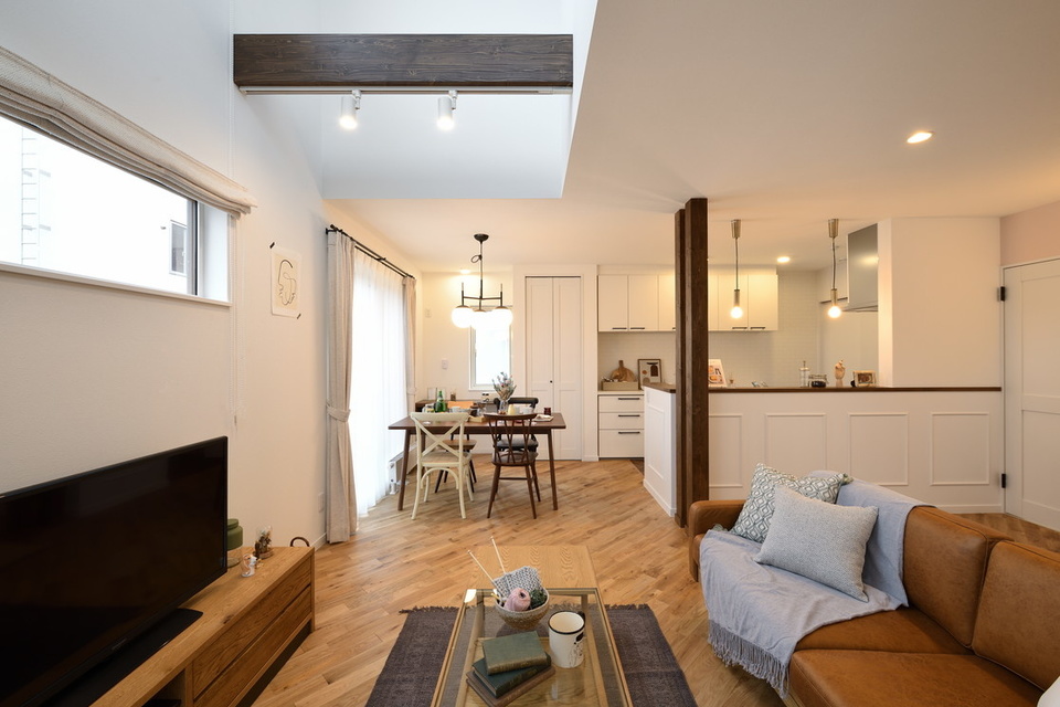 リビングの床はナラの無垢材を斜め45度に貼り、クリア塗装で仕上げたこだわりポイント。自然素材を使った飾らない雰囲気はそのままに、空間にリズミカルな印象を与えています。