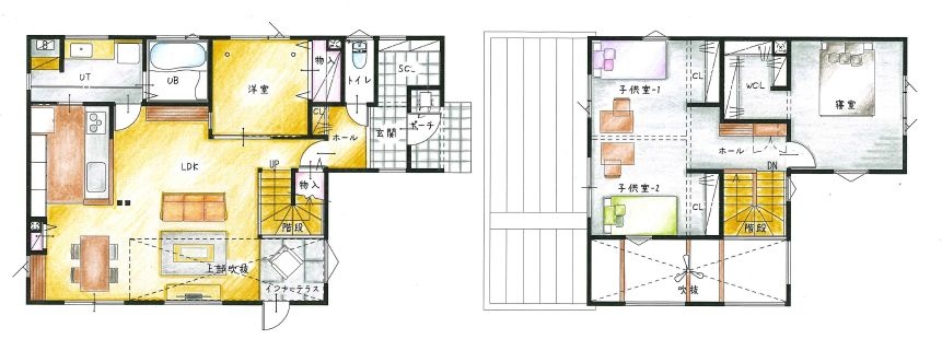 LDK全体が見渡せるキッチンや、家族の行き来を見守れるリビング階段は、イネスホームが子育て世代に向けてプランニングする際の基本要素です。