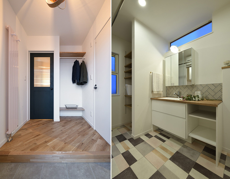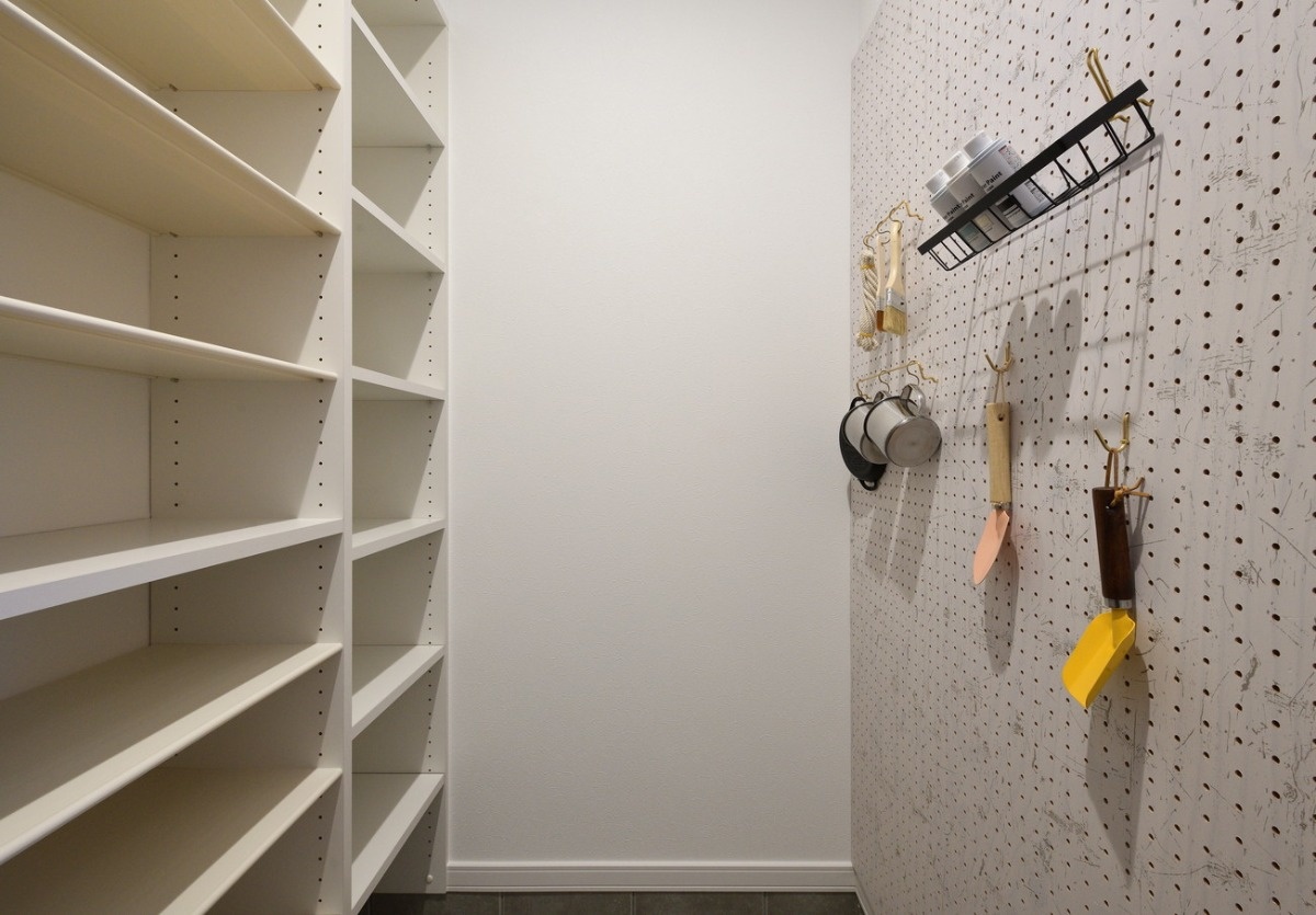 玄関には土間続きにシューズクローゼットをプラン。ベビーカーや三輪車なら十分に収まるスペースになっています。インテリア性の高い有孔ボードの壁面は、趣味の道具や、上着、子どもの遊び道具、傘など、掛ける収納としても重宝しそうです。