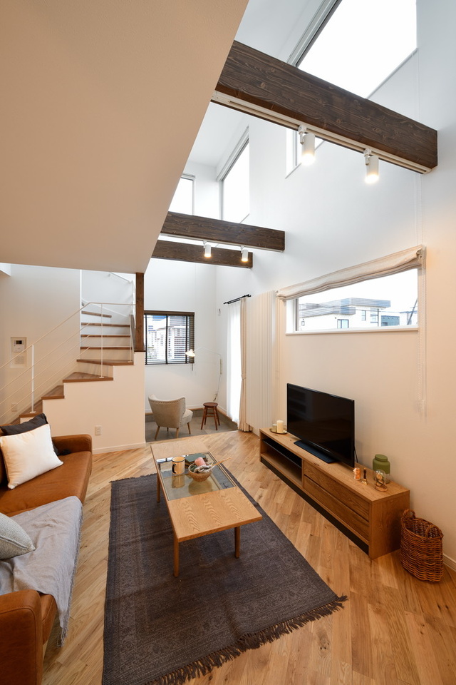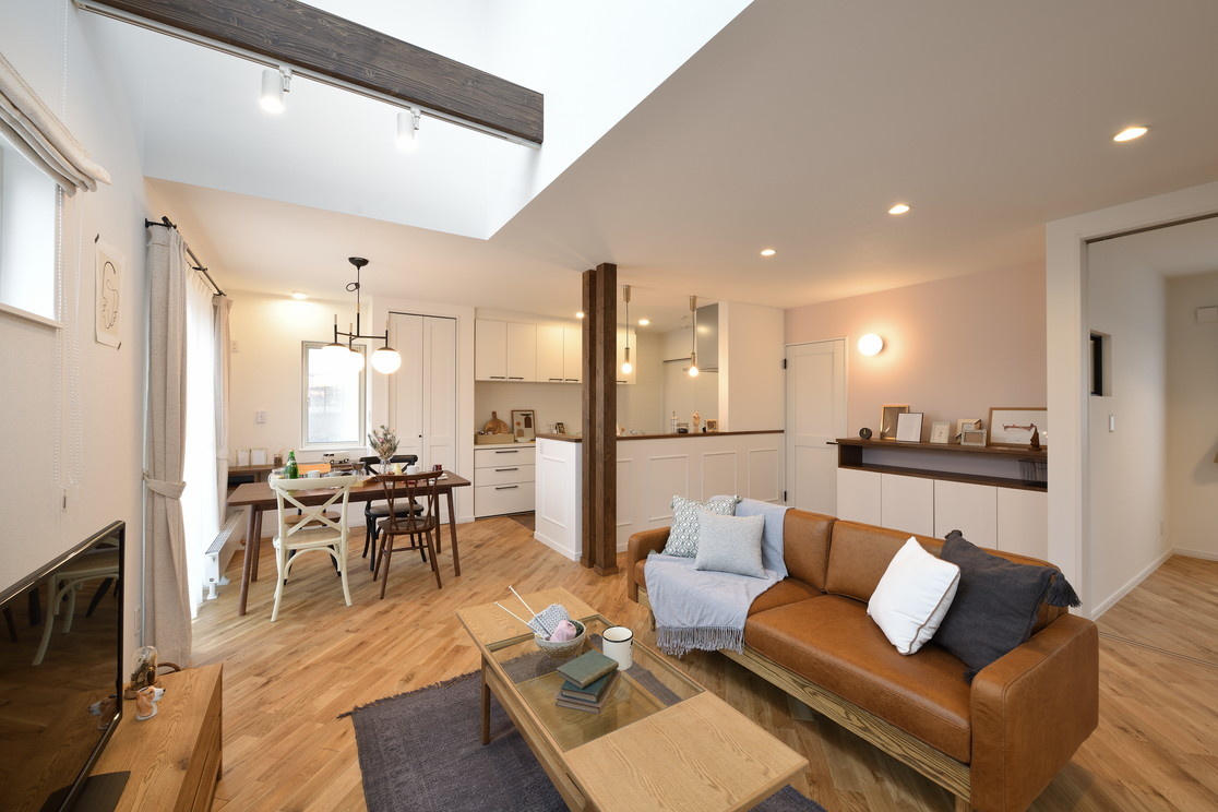 インテリアプランについてたずねると、「今回は家具が入るまで、本当にどうなるか不安でした」と阿部さん。前回のモデルハウス「fille+(フィーユプラス)」の内装が明るい色で統一されていたのに対し、「slow+」は濃いブラウンを梁や柱に使ってアクセントにしています。