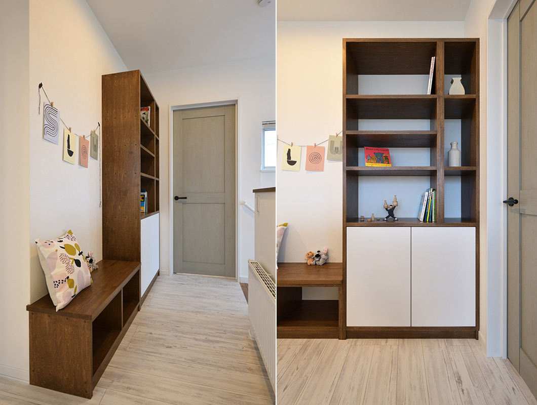 2階のホールには本棚とベンチにもなる収納をプラン。「ベンチ横の本棚下段は、お子さんの手が届くように高さを設定しました。寝る前の絵本の読み聞かせにも適したスペースになっています」と阿部さん。目的ごとに過ごすスペースが変化するのは、子どもの生活リズムをつくることにも役立ちそうです。何より、こうしたとっておきのコーナーがあるということが、ヒュッゲな暮らしにつながりそうです。