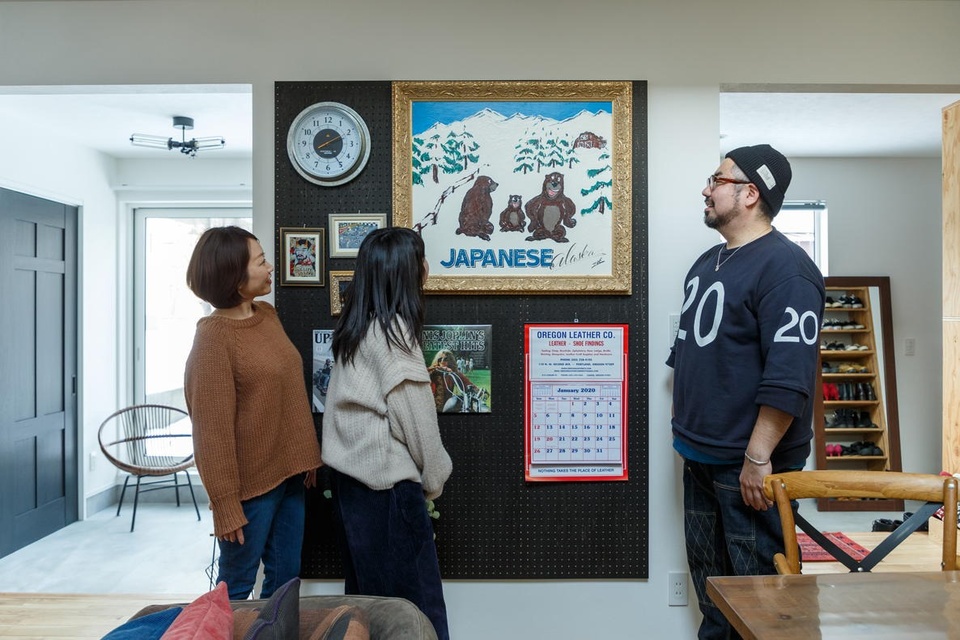 なかでも目を引くのが、リビングの有孔ボードに飾られた大きなクマの絵。「知り合いのアーティストさんにボクたち3人をイメージして描いてもらったんですよ」仲良しファミリーの雰囲気がよく伝わってきますね。
