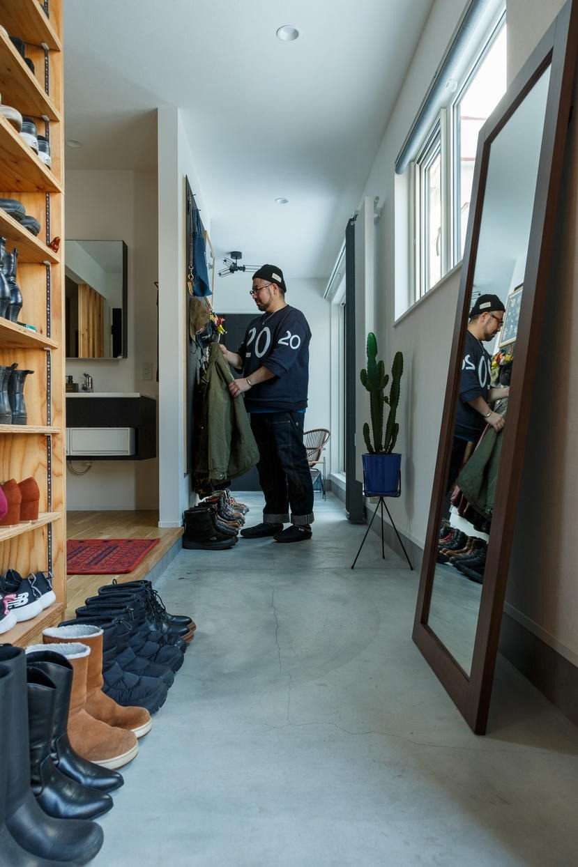 玄関ドアから6m以上、まっすぐに伸びる土間。写真の手前側からダイニング・キッチンへ、奥に行けばリビングへ直接上がることもできる、便利な2Wayアクセスです。