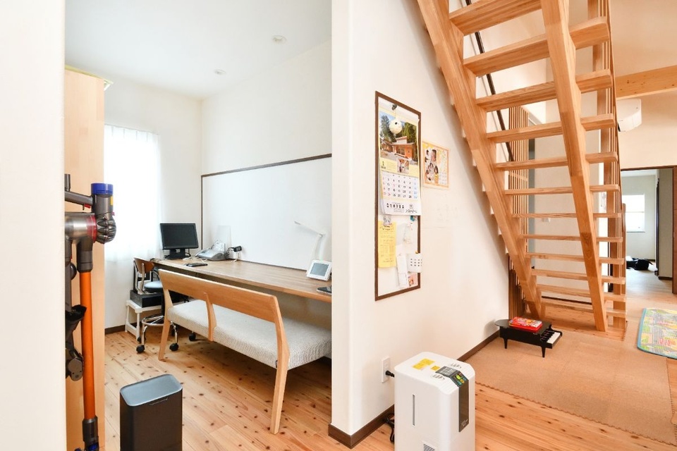 キッチンの横にはスタディコーナーも設置。長いカウンターテーブルで家族一緒に並んで勉強ができます。