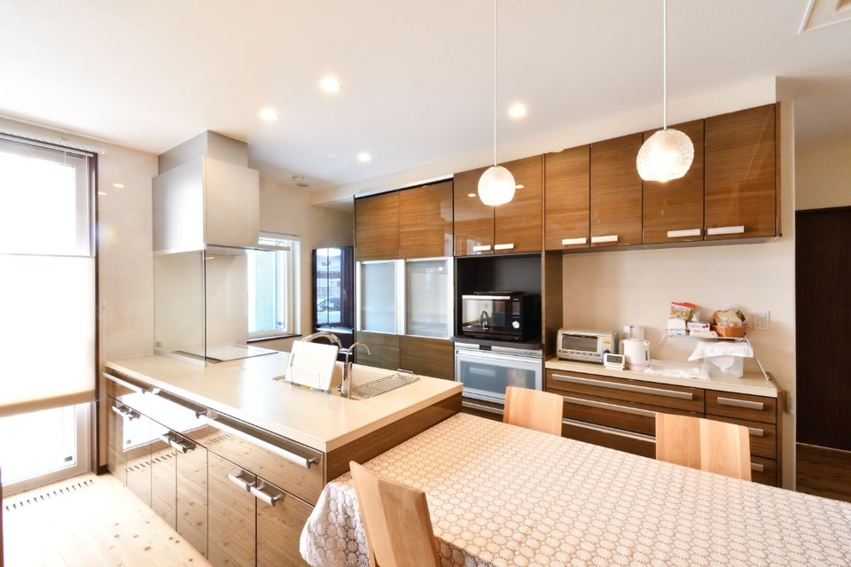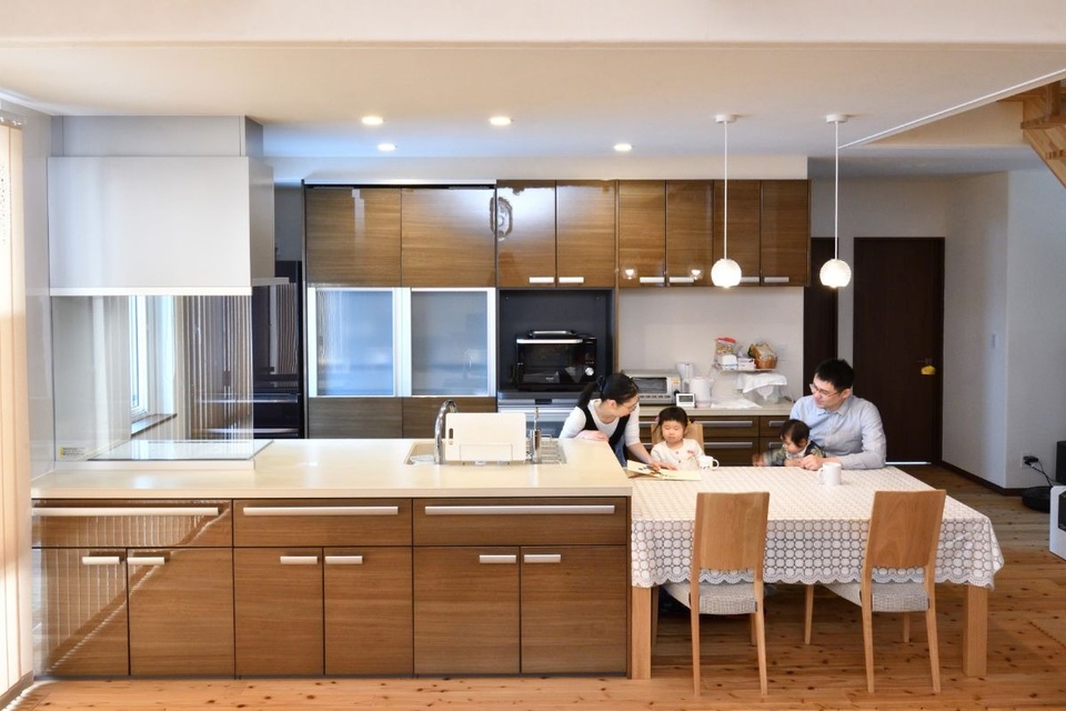 対面型のキッチンの横にダイニングテーブルを設置し、家族一緒に食卓を囲みます。