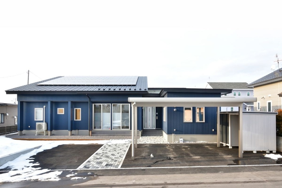 2019年末に完成した七飯町のH邸。外観はガルバリウムの外壁やソーラーパネル、カーポートなどが印象的なシンプルモダン系のデザインです。