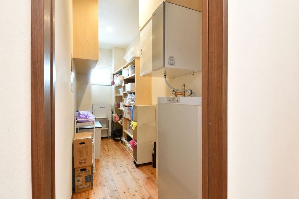 細長いスペースを確保して、飲み物や食品、家事に必要なアイテムをストックする食品庫を設けました。