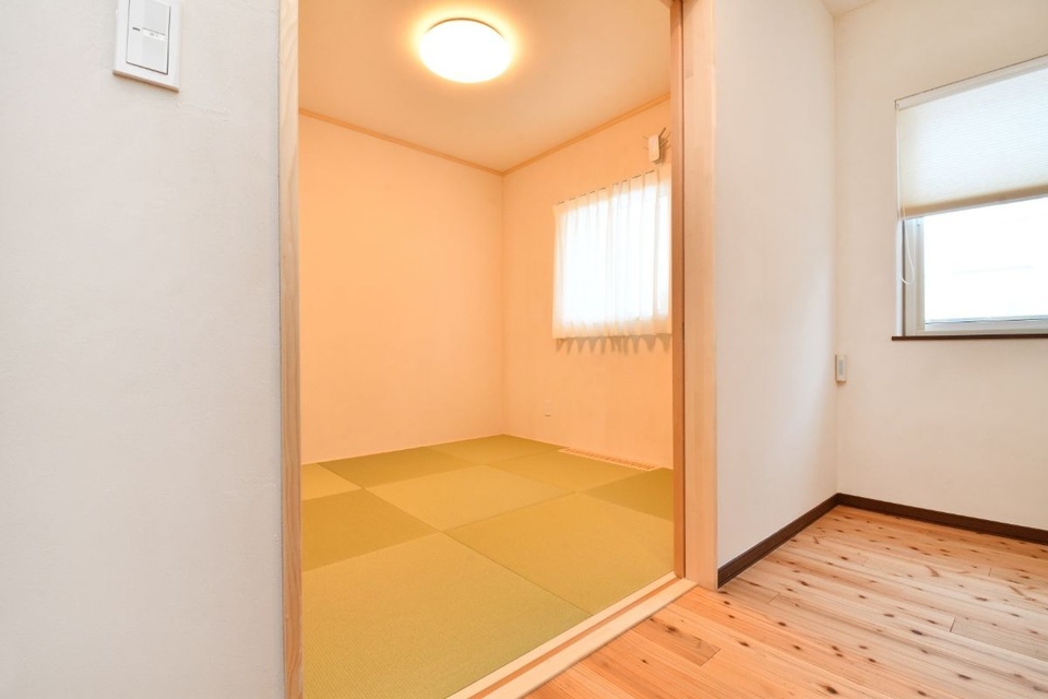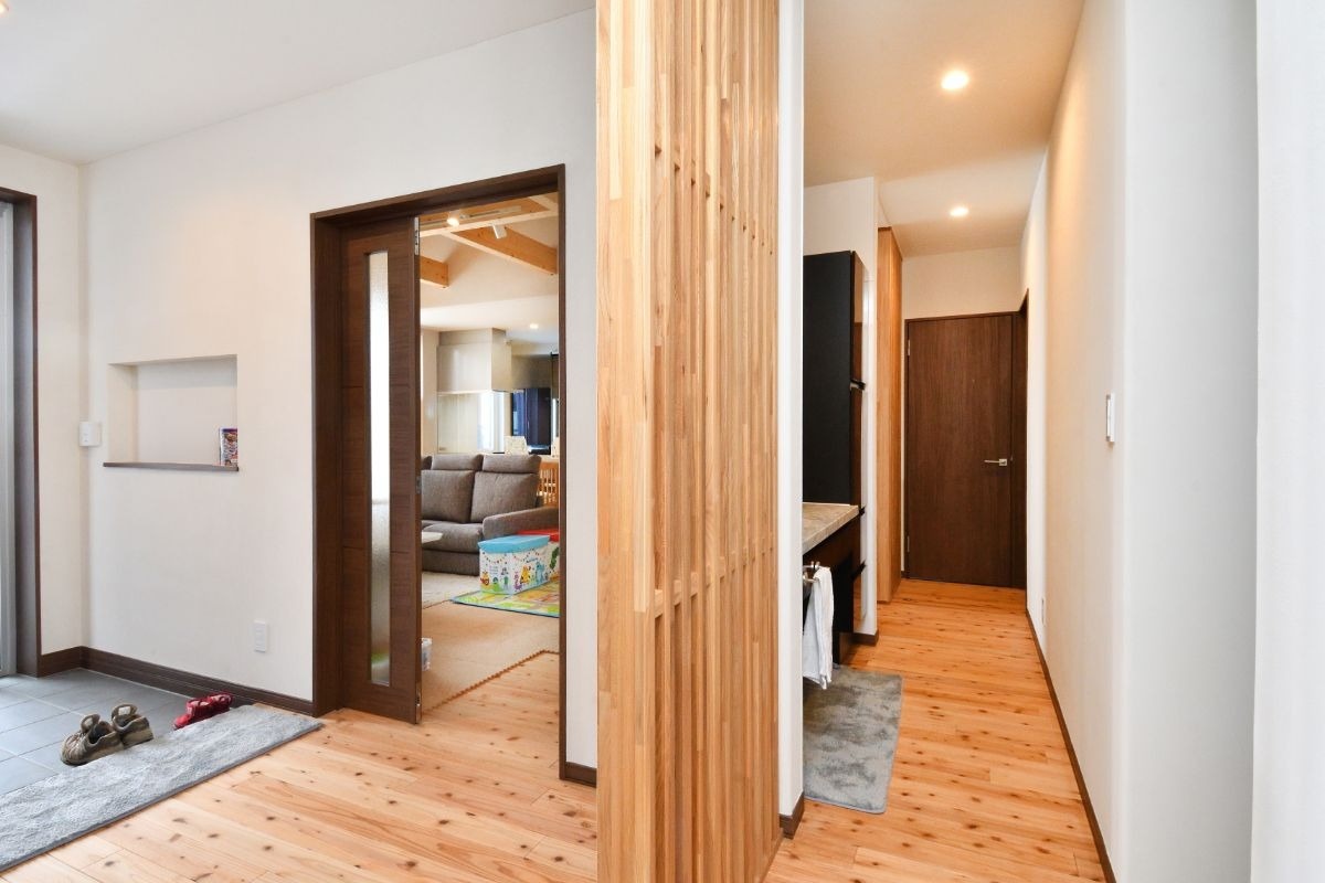 足ざわりがとても柔らかくて気持ちが良い無垢材、飫肥杉(オビスギ)を床材に採用しました。やわらかいのでお子さんのいる家庭では傷が目立つ面もありますが、裸足で歩いたときの気持ちよさが魅力で採用しました。大きな傷がついた場合は1枚単位で交換も可能です。