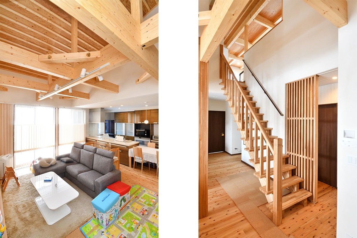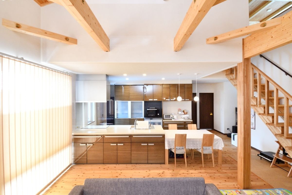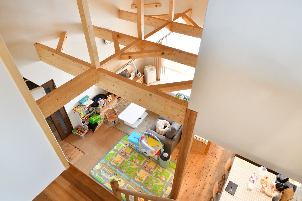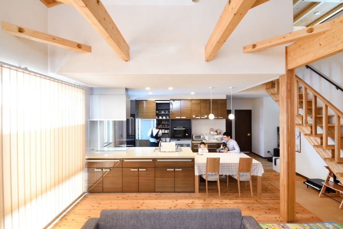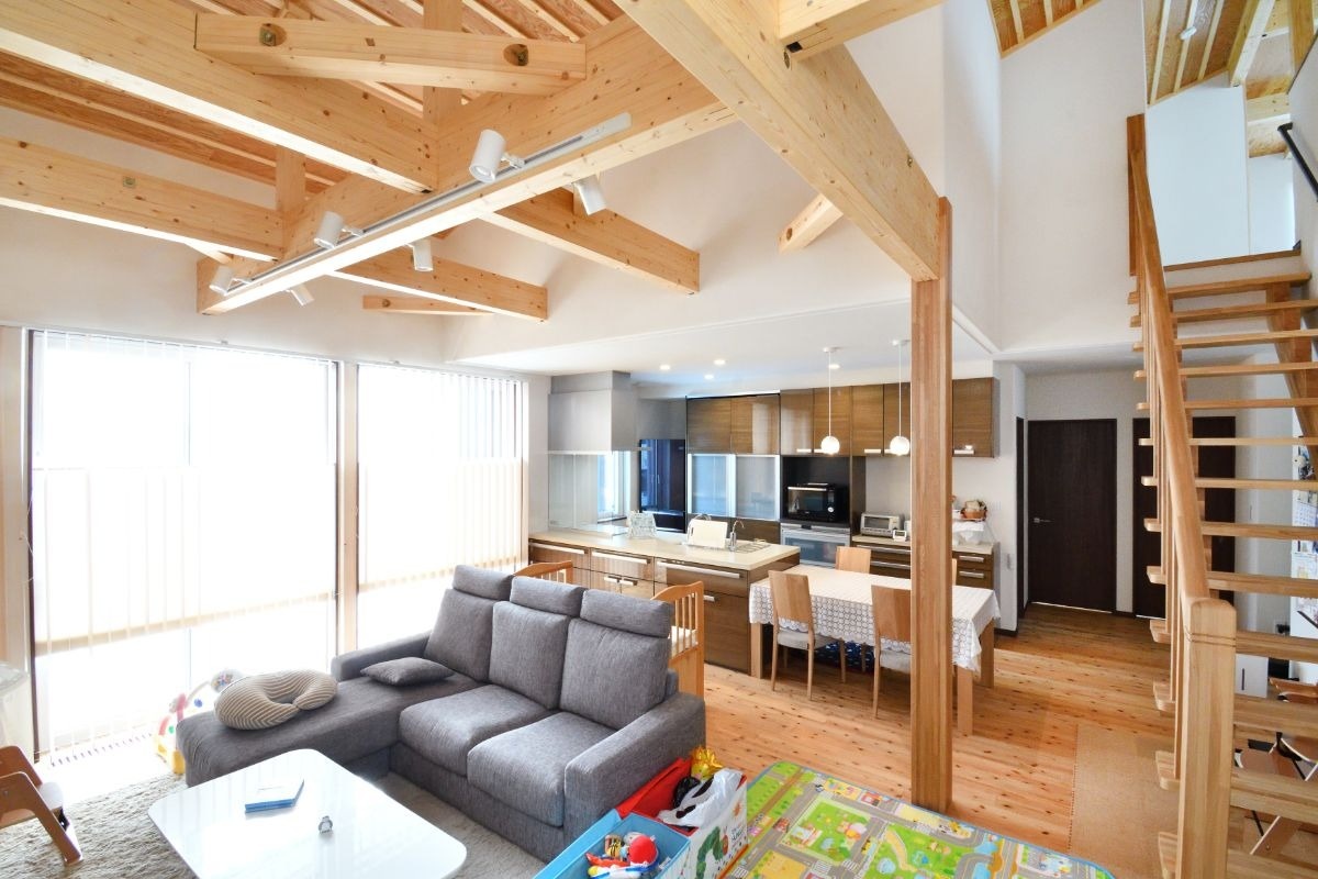 リビングは大きな吹き抜け空間で、あらわしの梁を見上げると思わず「うわー」っと声が出てしまいます。