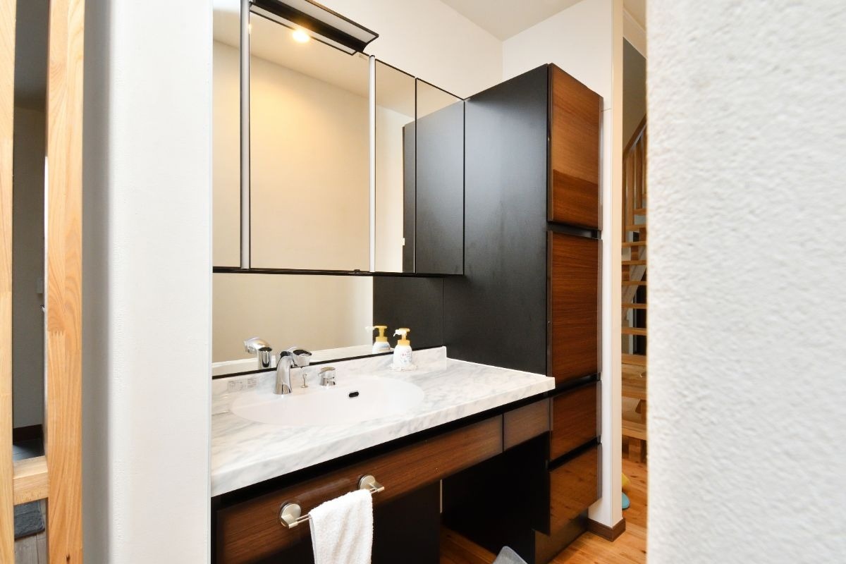 奥さま 事務所にお邪魔して打ち合わせ、そしてリクシルなどのショールームでキッチンを見たりしながら決めていきました。渋谷社長が考えてくれたプランをもとに、私たち夫婦、そして父も一緒に考えてくれました。洗面室を個別の部屋ではなく回遊動線の中に組み込むアイデアは父のアドバイスです。