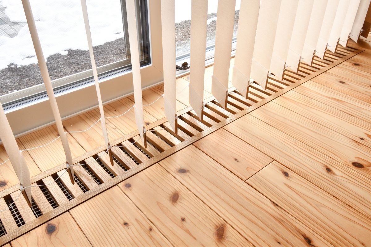 窓際に設置されているガラリは、床下にある暖房機からの暖かい空気が出てくる仕組みです。室内の壁際などに暖房機がないということは、家がすっきりする、暖房機の拭き掃除がいらないというメリットもあります。