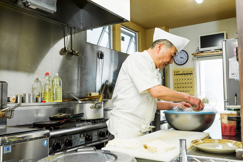 「ほら、カレー皿に盛り付けするサラダでしょ、ご飯を盛るでしょ」と実際に動きを再現してくれました。調理場が細長いと、体を動かさず、向きを変えるだけでいろいろな工程をこなせます。一人で調理するために最適化され、無駄がなく疲れにくい動線なのです。