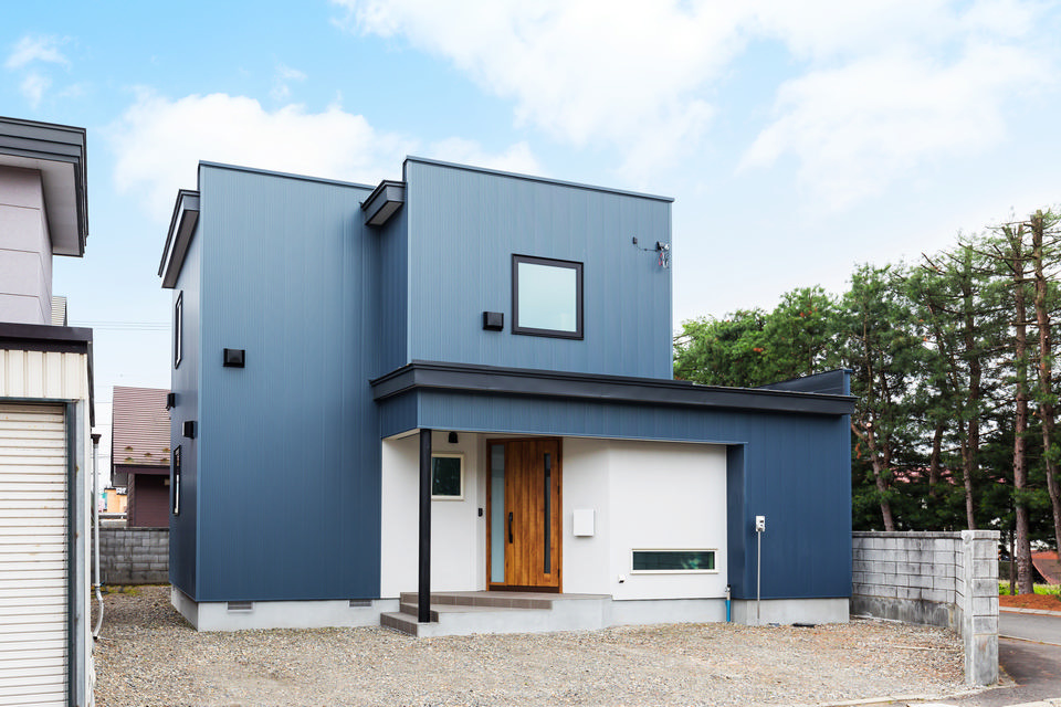 Tさん邸は、帯広市内の閑静な住宅地に建っています。濃いブルーの外壁がおしゃれな感じです。斜めについた玄関ドアがかっこいいですね。