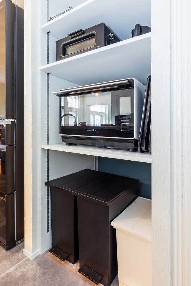 シックな黒いアイテムでまとめたキッチン。黒のかっこいいダストボックスは、KEYUCA arrots ダストボックスII