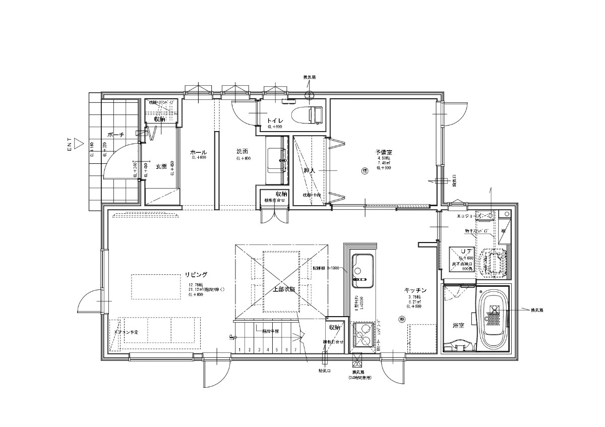 1階のキッチン横に予備室を確保した4LDKプラン。子どもたちのプレイルーム、趣味の部屋やリモートワークスペース、来客用の就寝スペースなど、いろんな使い方がありそうです。