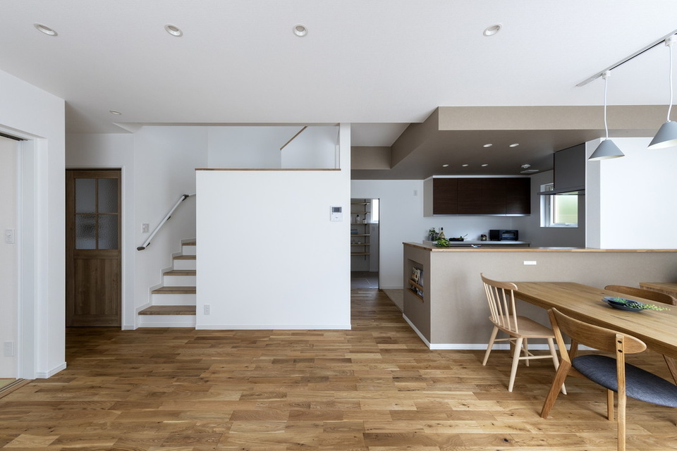 ゆったりとした空間が広がるLDKは、階段を中心に、玄関からユーティリティ、キッチンへと続く家事動線とつながる便利な回遊式になっています。