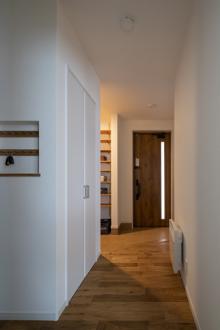 玄関横には大容量のシューズクロゼットを確保しました。向かって玄関ドアの右手はユーティリティーにつながっており、帰宅後すぐに手洗いやうがいができる動線にしています。