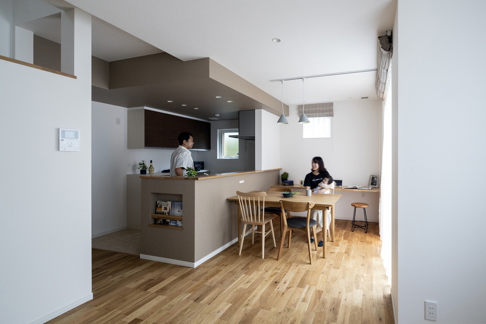 玄関からユーティリティ、キッチンへと抜ける回遊動線は、「うがいや手洗いを済ませてから室内に入りたい」という、きれい好きのOさんの希望でした。「今の時代にぴったりですよね」と奥さま。