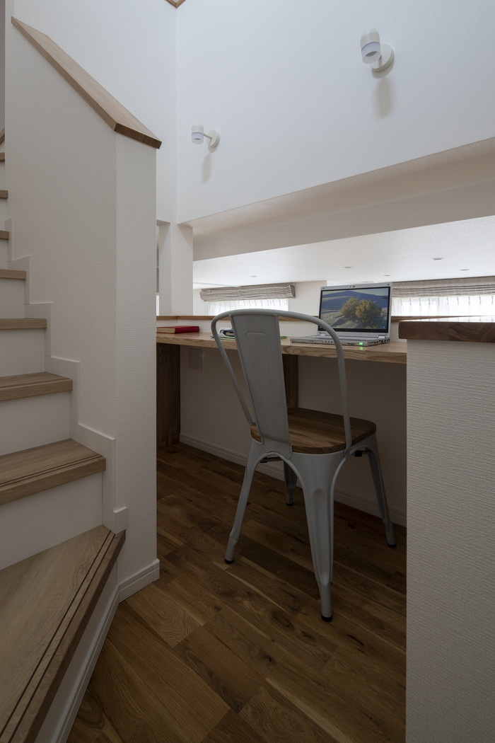 中2階のワークスペースもOさんの希望。リビングに面した吹き抜けで、「家族の気配を感じながら、集中もできる快適な場所になりました」と大満足のご様子。今後も増えそうなリモートワークでも活躍しそうです。