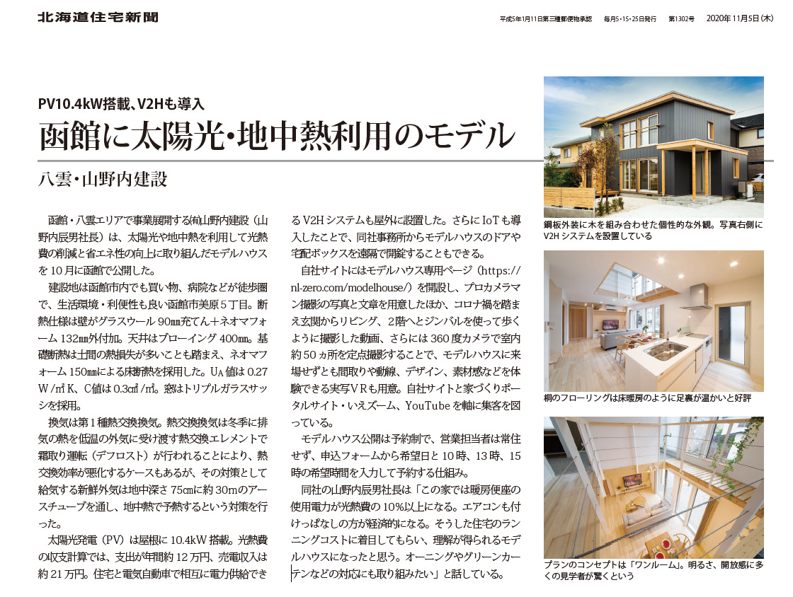 函館・八雲エリアで事業展開する㈲山野内建設(山野内辰男社長)は、太陽光や地中熱を利用して光熱費の削減と省エネ性の向上に取り組んだモデルハウスを10 月に函館で公開した。