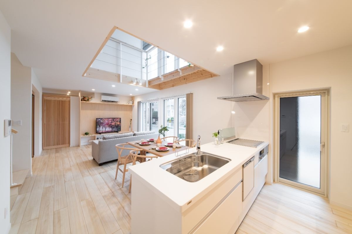 建設地は函館市内でも買い物、病院などが徒歩圏で、生活環境・利便性も良い函館市美原5丁目。断熱仕様は壁がグラスウール90㎜充てん+ネオマフォーム132㎜外付加。天井はブローイング400㎜。基礎断熱は土間の熱損失が多いことも踏まえ、ネオマフォーム150㎜による床断熱を採用した。UA 値は0.27W /㎡ K、C値は0.3㎠ /㎡。窓はトリプルガラスサッシを採用。