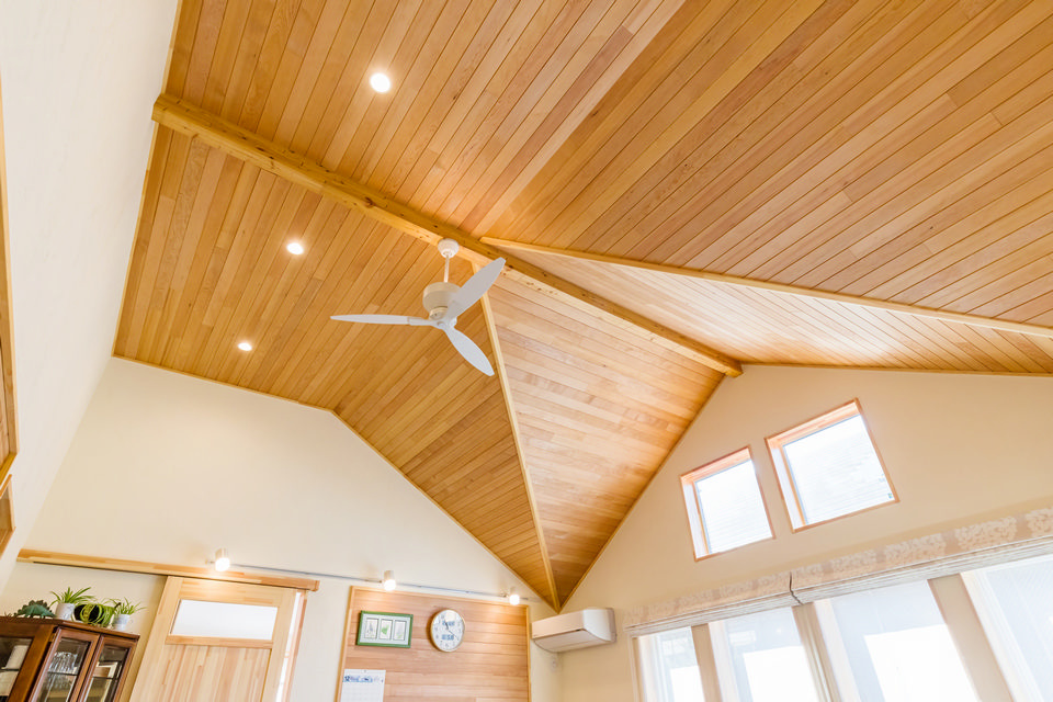 屋根形状を活かした梁のないデザインはご主人の希望で、「天井をつくるのはとても大変そうでしたが、梁を無くしたことで高窓から星空を眺めることもでき、正解でした」とご主人。
