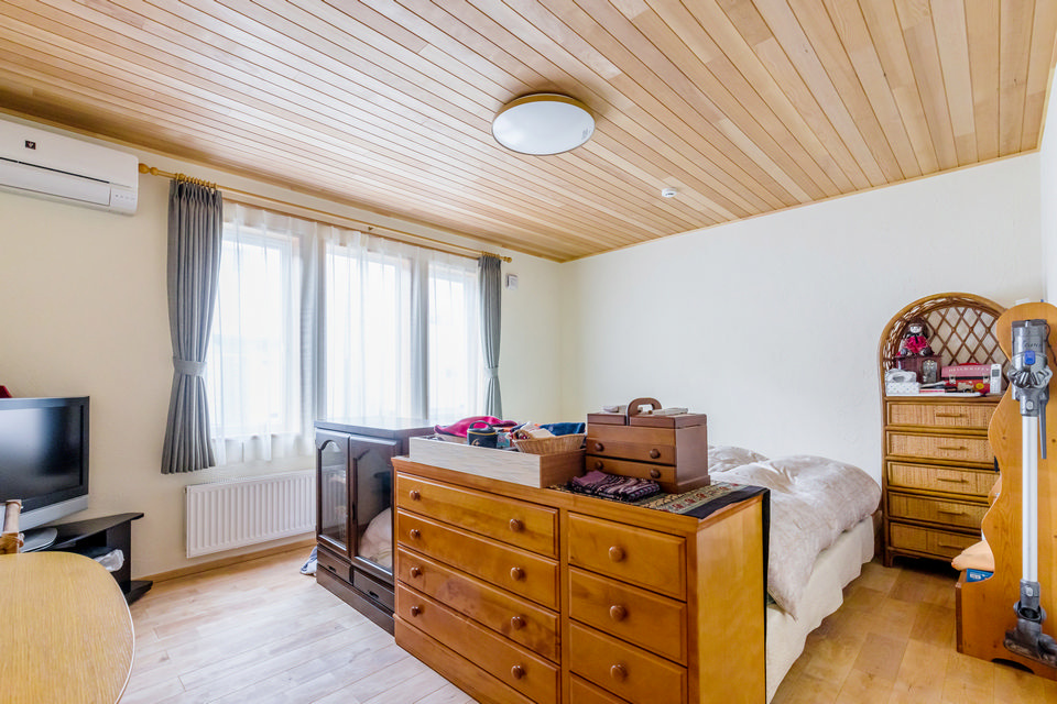 寝室の天井にも羽目板を使っています。廊下を挟んでトイレがあるため、夜間に用を足すのも便利です。