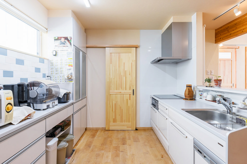 キッチンは背面収納を薄型タイプにしたおかげで、ゆったりとした空間になりました。奧に見えるのは食品庫につながる引き戸で、食材の出し入れにも便利な動線です。