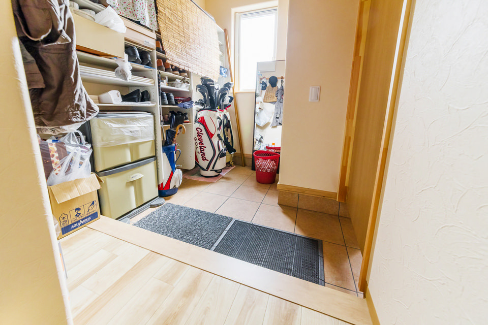 棚を作った収納力抜群のシューズルームには、ご主人が趣味で楽しまれているゴルフの道具も収まっています。