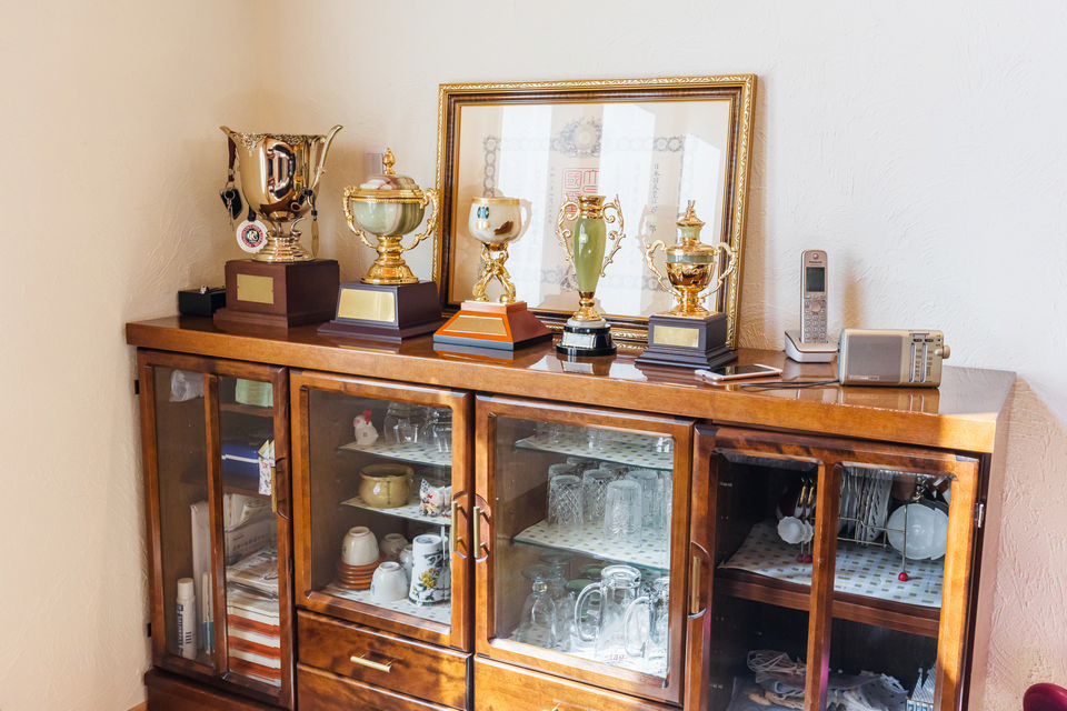 リビングの一角にはご主人がゴルフコンペで勝ち取ったトロフィーが飾られている
