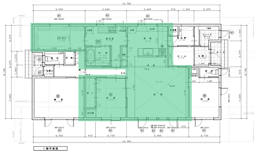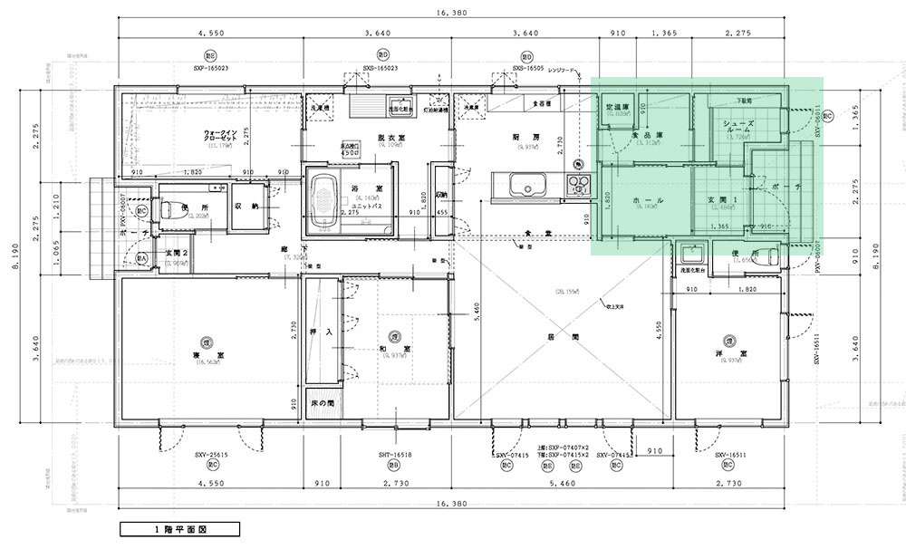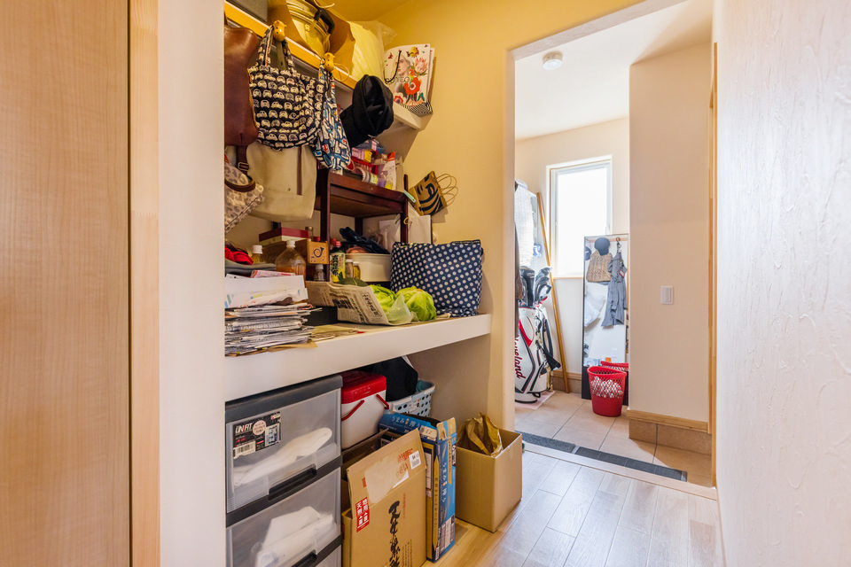 こちらはシューズルームとホール、キッチンの3方向につながるパントリー(図面では食品庫)。
