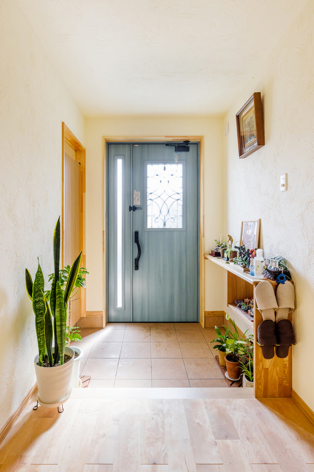ペールブルーの親子扉が印象的な玄関ドア。「光が入り、明るいので、窓付きの玄関ドアにしてよかったです」と奥さま。玄関横にはシューズルームも設けています。