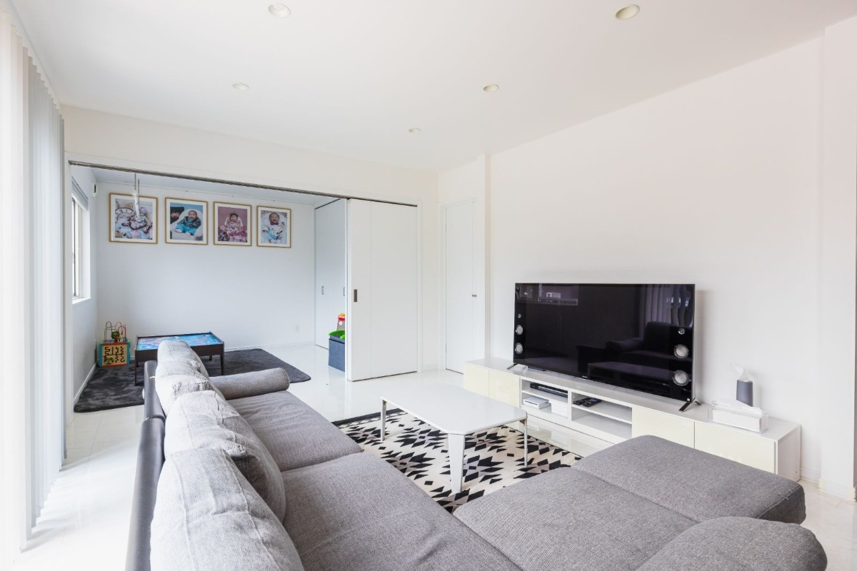 Uさんファミリーはご夫婦と4人のお子さんの6人家族です。玄関に入るとすぐに目に入るのが白く光沢のある大理石調の床材。高級感があり明るい印象です。