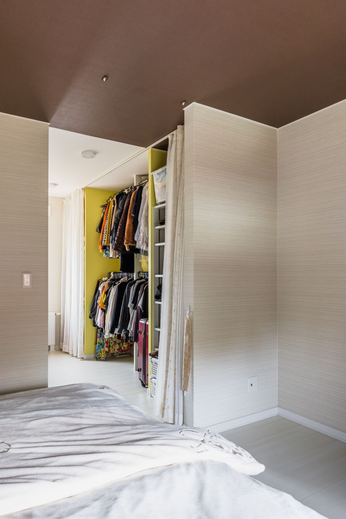 ご夫婦の寝室はブラウンの天井で落ち着いた仕上がり。ベッド以外の家具を置かず、シンプルで上質感ある空間になっています。