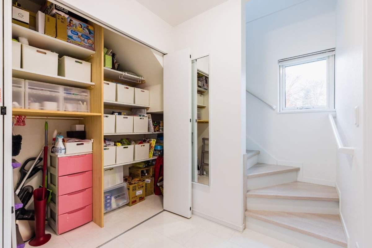 廊下の突き当りにも大容量の収納が。急な来客時もここに片付けて扉を閉めれば1枚の壁のようになるため、1階は常に片付いた印象です。