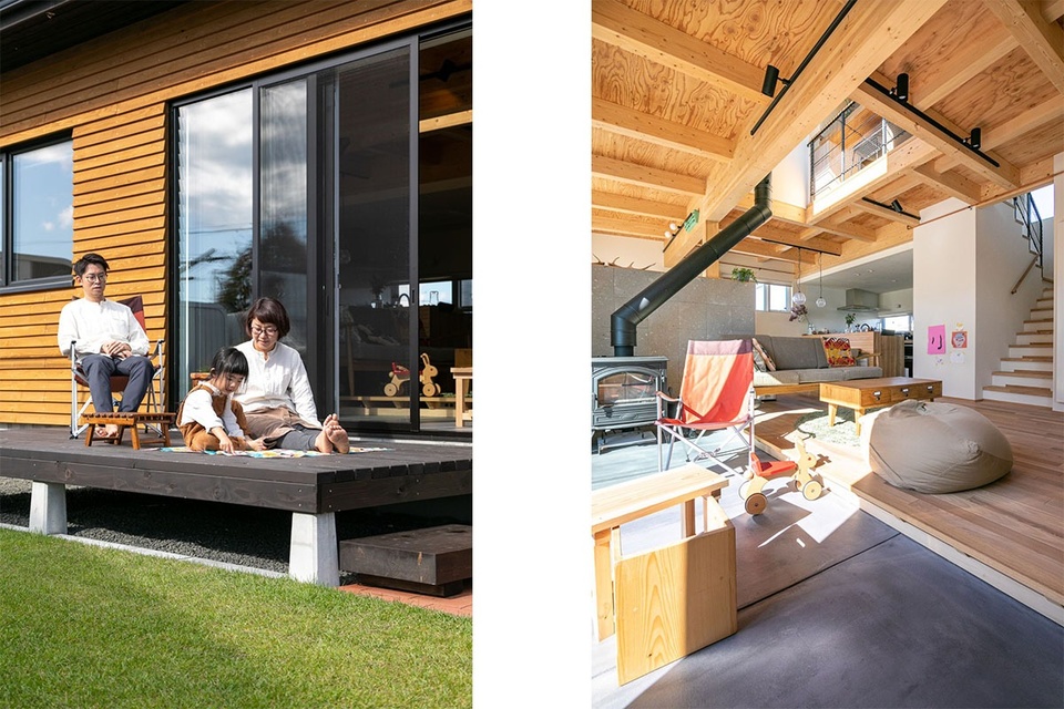 ウッドデッキが土間と同じ高さでつながっているので、リビング、土間、ウッドデッキが広い一体の空間として、自宅でのミニキャンプ、ご友人とのBBQに大活躍です。2階とつながる吹き抜けもあり、広々とした印象です。奥さまは「外食はコロナが心配でもあるので、ウッドデッキで家族と焼肉をして楽しんでいます」と話してくれました。