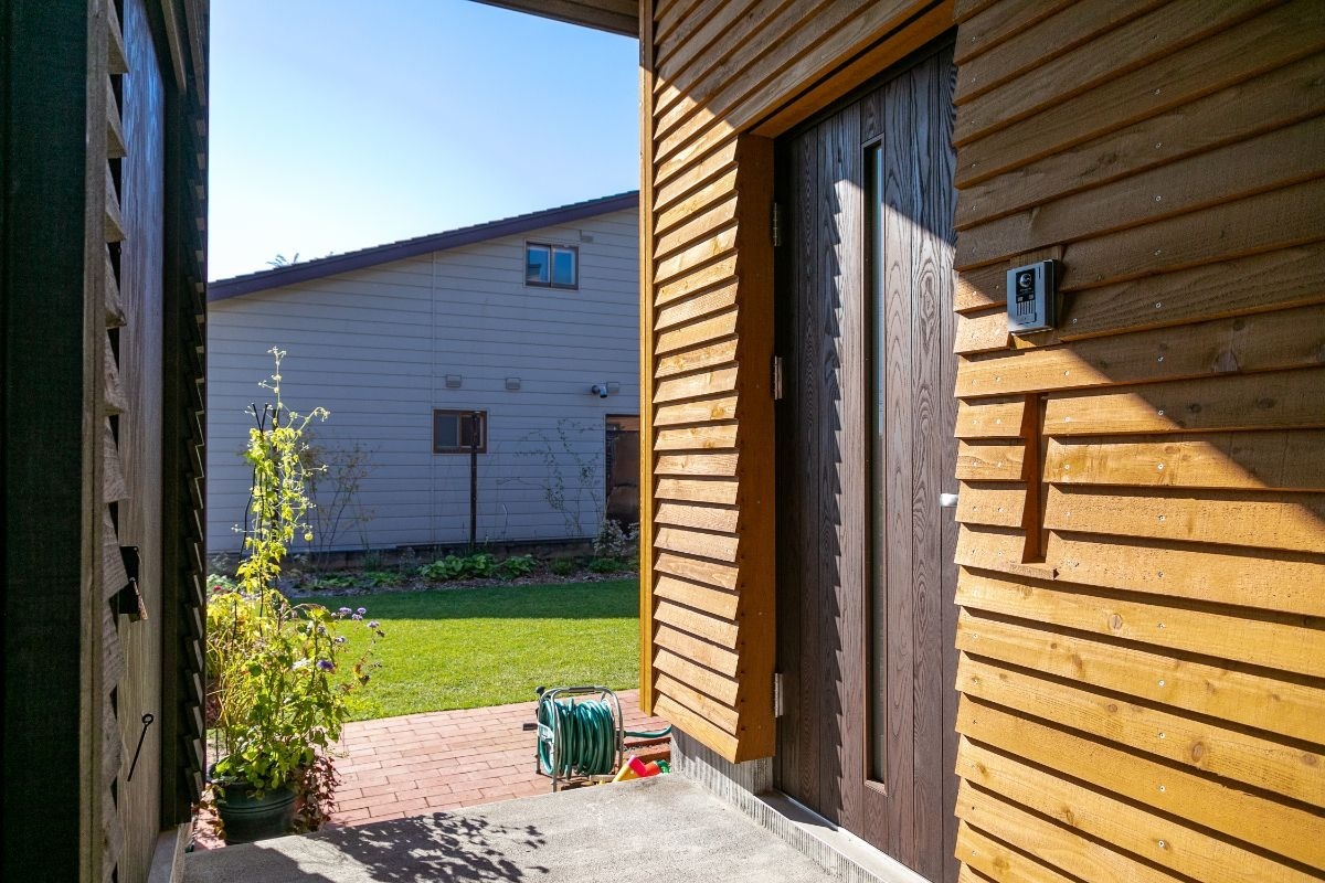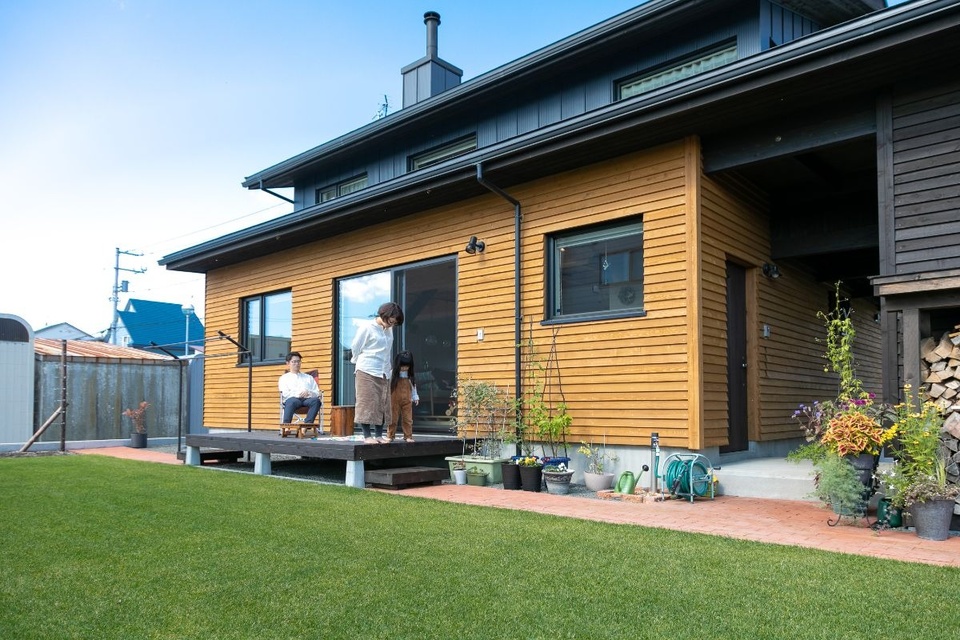 木製の玄関ドアと板張りの外壁が、暖かみのある家の印象になり大変似合っています。