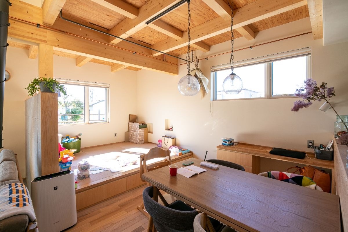 土間は子どもはもちろん大人もそこを素足で歩いてリビングのように使っています。2019年12月に住み始め、高断熱高気密で窓もトリプルサッシを使っているのでとても暖かく光熱費も大変安くて助かっています。要望をたくさん実現できた家づくりはとても満足しています。