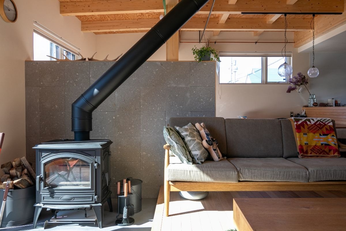 キャンプやアウトドアが好きなので、薪ストーブを土間においてもらいました。灯油セントラルヒーティングで暖房設備しているので、それでも暖房できますが、真冬は、朝起きて薪ストーブを焚くのが楽しいですね。