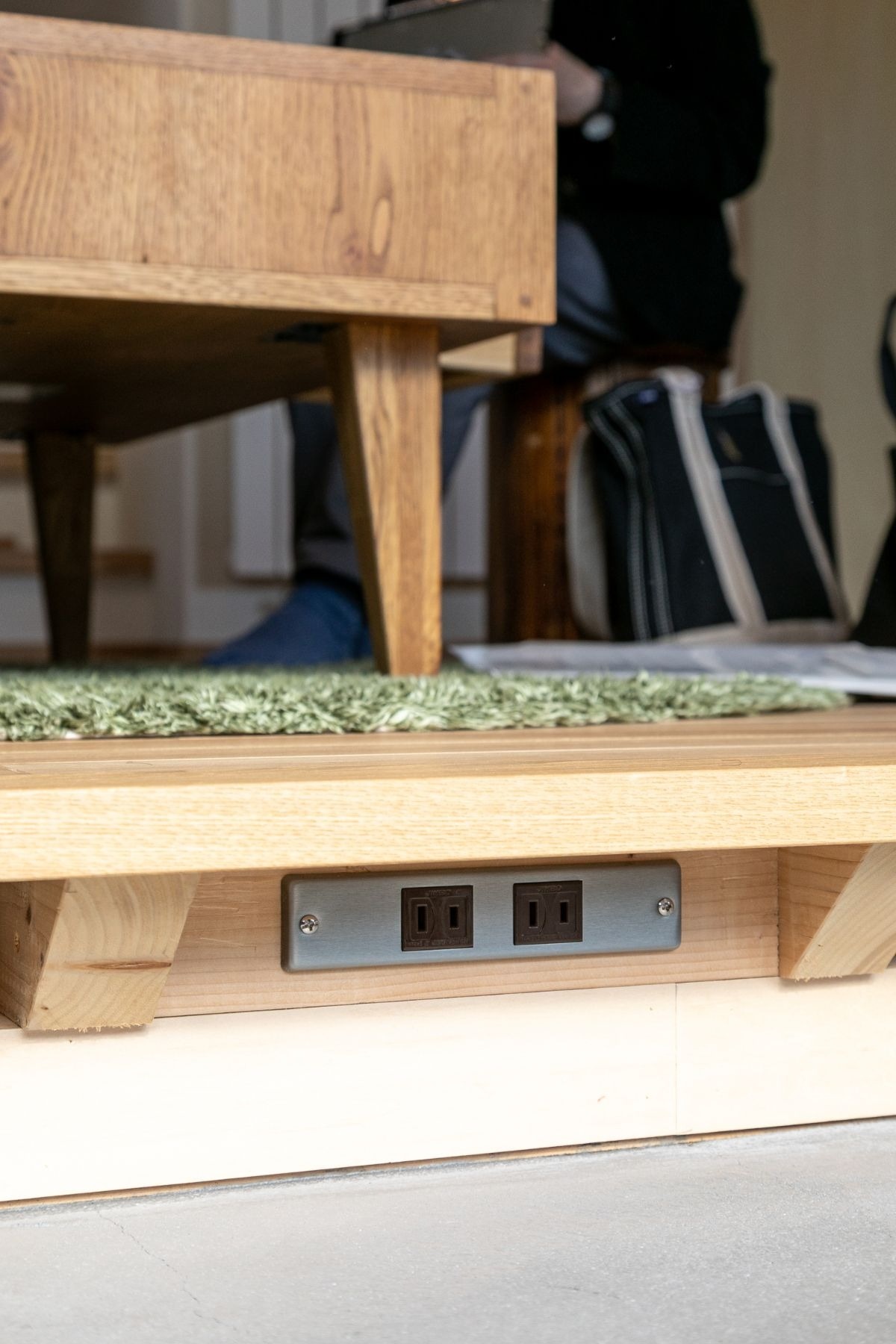 土間とリビングの段差を活かし、目立たないこんな場所にもコンセントがありました。アイロンや加湿器、スマホなど思った以上にコンセントは必要になるのでコンセントは多めに配置しました。