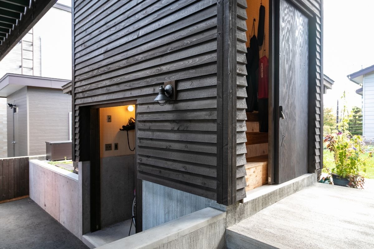 カーポートの後ろには物置を設置。実はこの物置、1.5階建てのスキップフロアになっています。カーポート側からは家族3人の自転車などを保管できますし、玄関側からは1.5階部分にある収納スペースにガーデニングの道具や趣味のアイテムが収納できます。物置をスキップフロアにするという提案にはYさんも驚いたそうです。