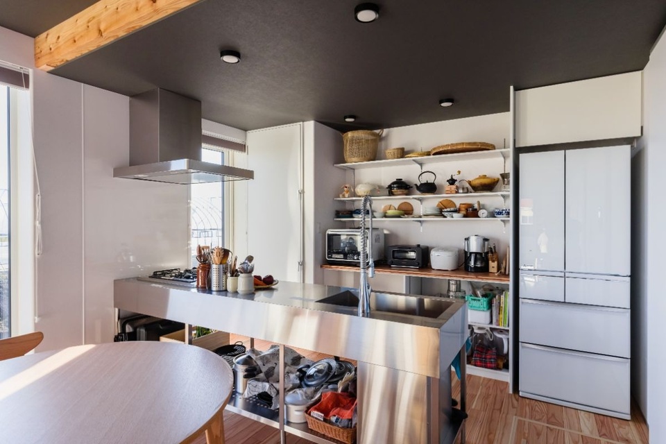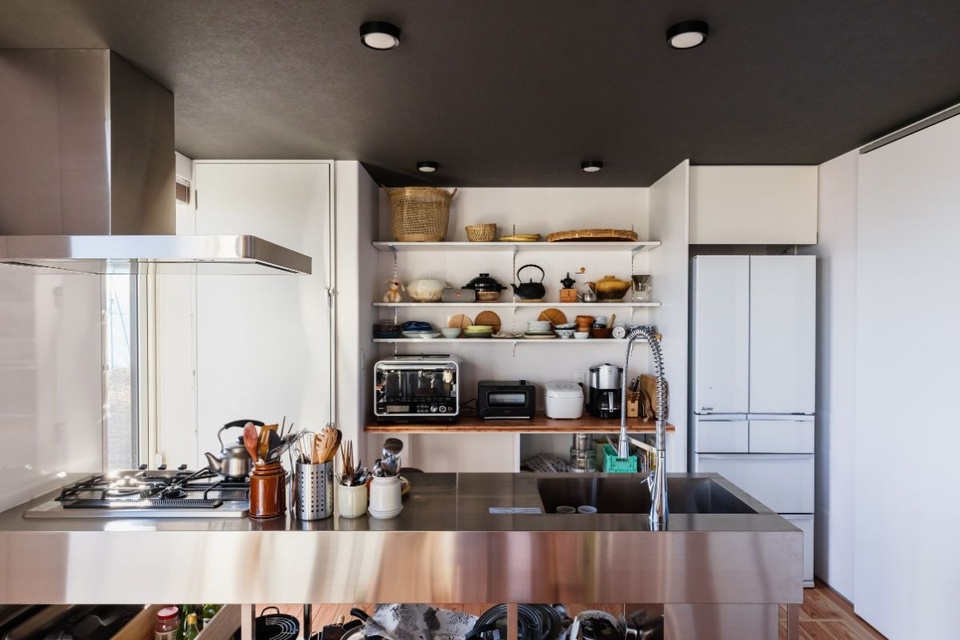 無駄のない機能美が際立つフレームキッチン。スタイリッシュな水栓が印象的です。あえてカウンターや板を付けず、鍋や食器を1アクションで取り出せる仕様にしました。
